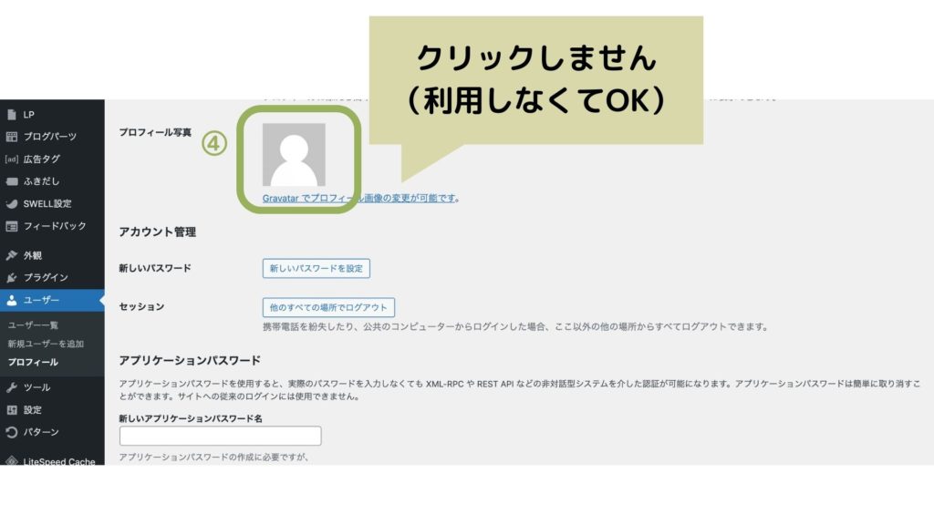 ④プロフィール画像:ここでは設定しません。あとのSWELL項目でプロフィール画像が選べるので、クリックせずにこのまま進んでください。