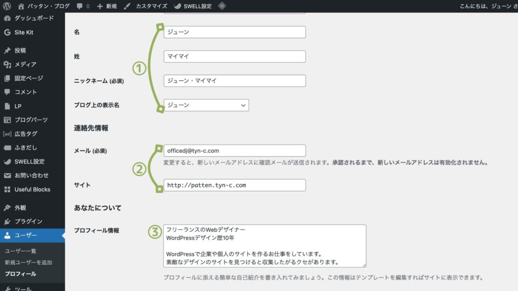 ①名、姓、ニックネーム(必須)を入力:名、姓は任意なのでなくてもOKです。「ブログ上の表示名」を確認しましょう。