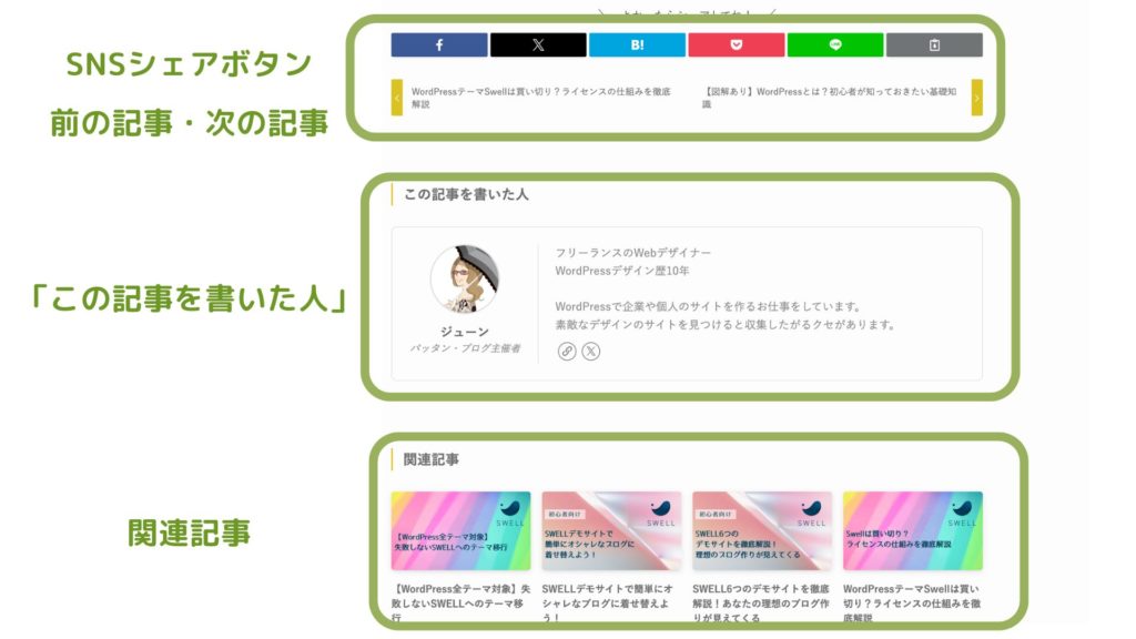 順番は、「前の記事・次の記事」→「この記事を書いた人」→「関連記事」の順番になります。