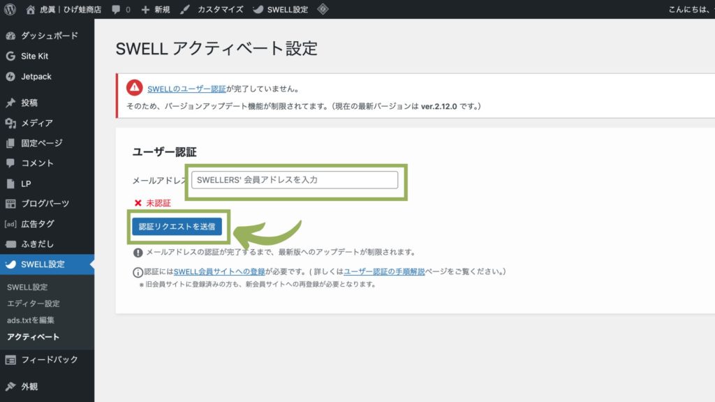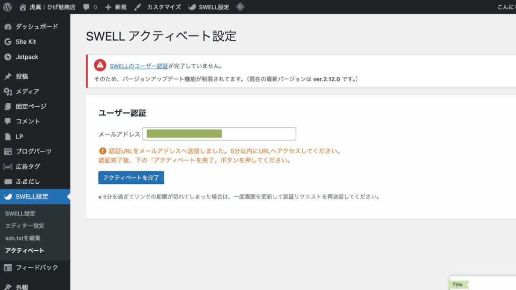 認証が完了するまで、「SWELL本体のアップデート」が管理画面からはできなくなります。(ダッシュボードの「更新」画面にアップデート通知が出現しなくなります。)